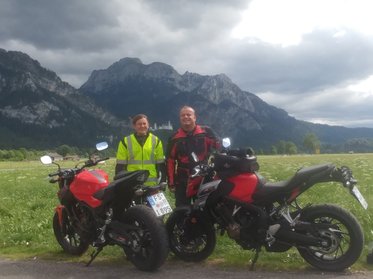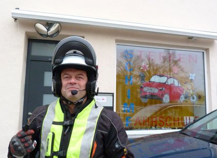 Wir schulen sehr gern von Motorrad zu Motorrad. Bis zur Prüfung verwenden wir ausschließlich 2-Wege-Funk, um stets aktuell wähend der Fahrt eure Fragen beantworten zu können. Zudem können wir so direkt reagieren, sollte euch beim Fahren mal "der Schuh drücken".