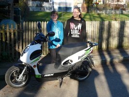 Unser Mofa-Roller Rex 25 e-Novation. Er tankt ausschließlich an der Steckdose und ist mit seinen 1,5 kW elektrischen Leistung sehr gut dabei. Die Mofa-typischen Merkmale "Lahm, laut & stinkt" treffen hier nicht mehr zu. Ab 15 Jahren zu fahren. Es ist kein Führerschein erforderlich, lediglich eine Prüfbescheinigung.